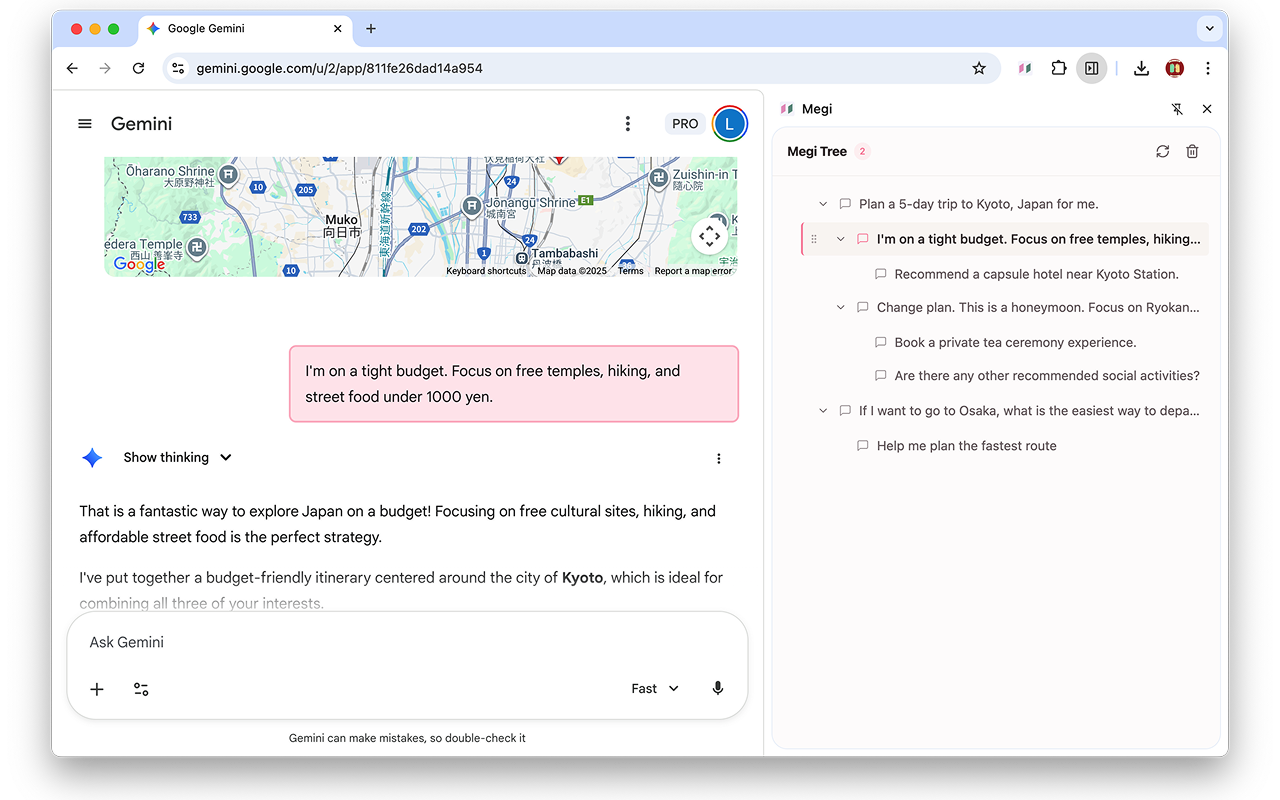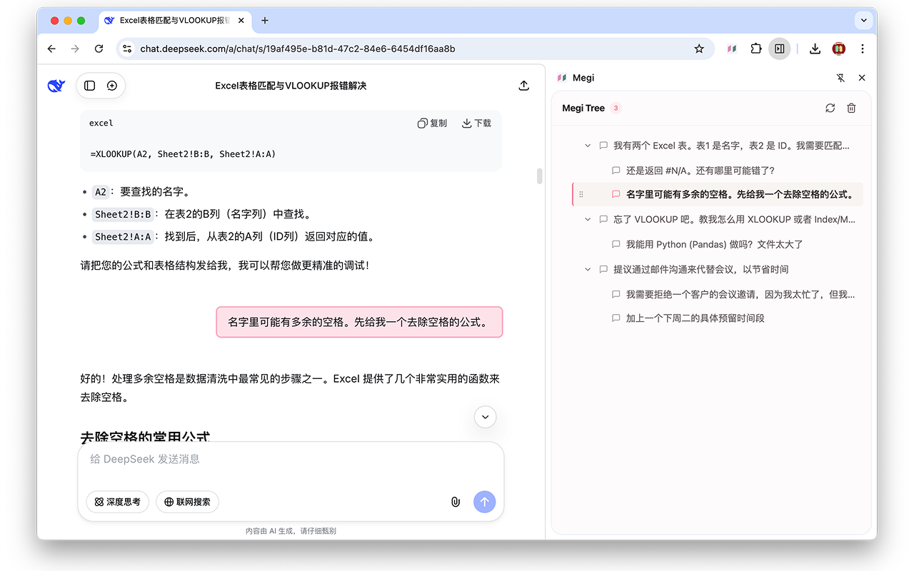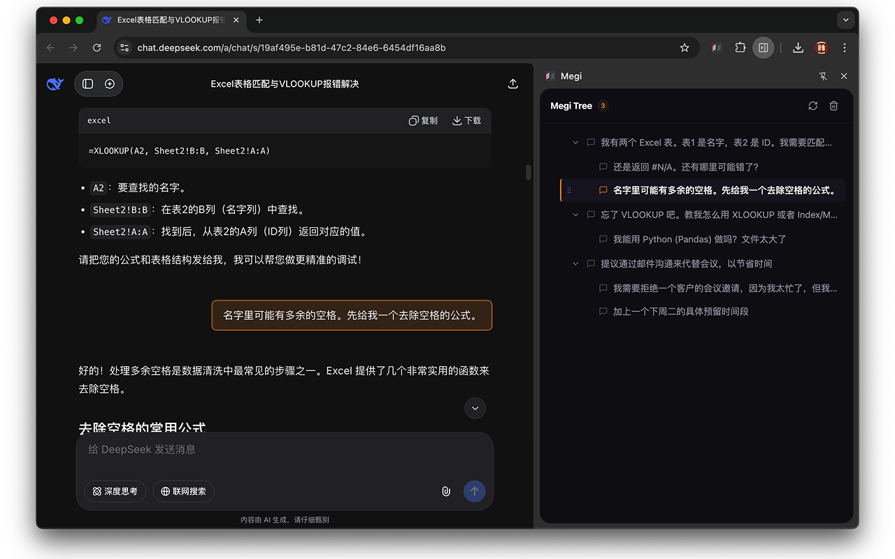 简单来说,Megi 是一个浏览器扩展,将原本平铺直叙的对话记录,重构为树状结构。