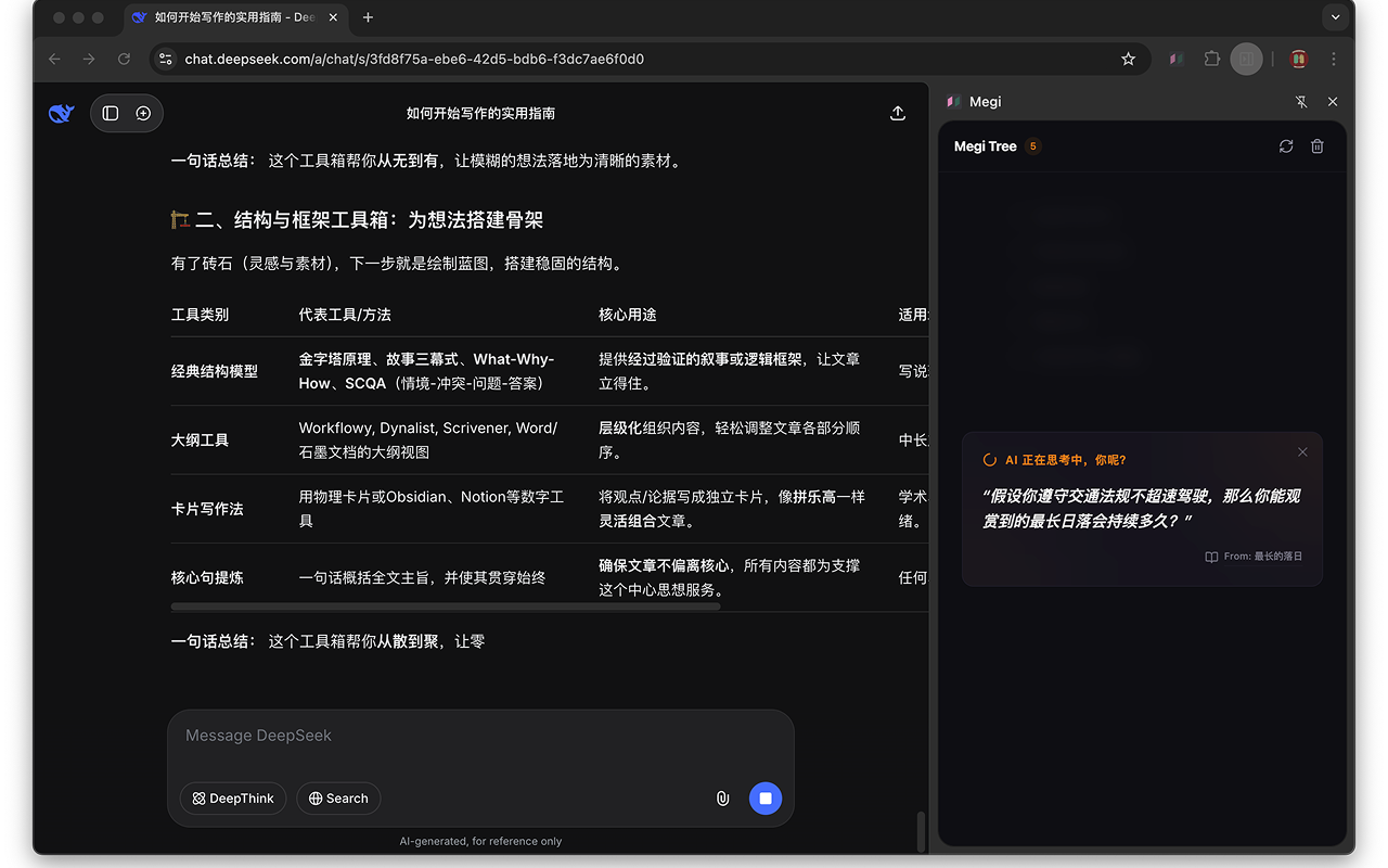工具的本质是思维的延伸。如果你厌倦了在长对话中迷失方向,如果你也认为“提问”本身就是一种高价值的创造,希望 Megi 能成为你 AI 之旅中的那根手杖。